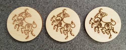 First, I cut and engraved 400 badges from 3mm ply. Then I cut and engraved the 12 souvenirs for the Jarl Squad parade stop off points. They were 300mm in diameter, so the artwork was much bigger. And I could engrave them much faster as the detail wasn’t as fine.