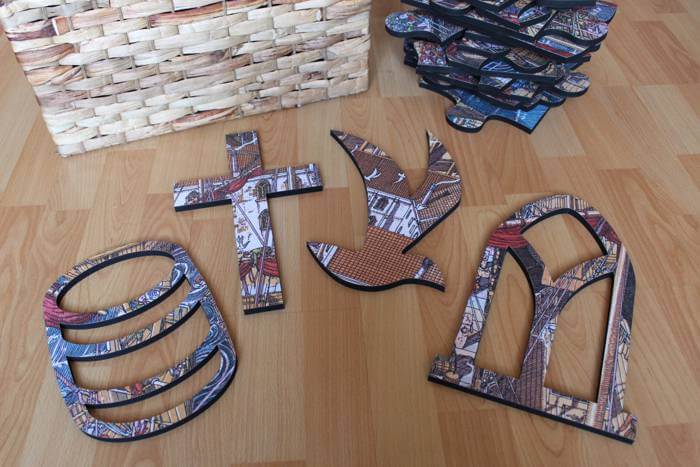 Wendy wanted the jigsaw to contain lots of interesting shapes that were not necessarily fully interlocking. She wanted to have four shapes, a barrel, a cross, a bird and a window incorporated into the design. I agreed that she could have whatever she wanted if she stuck to my vector artwork design tips!